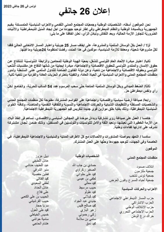اصدرت مجموعة من الشخصيات الوطنية و جمعيات المجمتع المدني و الأحزاب السياسية،بيانا تحت تسمية “إعلان 26 جانفي”، دعوا فيه إلى تمسكهم بايقاف مسار 25 جويلية معتبرين ان المسار الانتخابي الحالي فاقدا لكل مشروعية شعبية و معمقا للازمة السياسية مؤكدين في هذا الصدد لرفضهم لمنظومة 24 جويلية و ما قبلها .