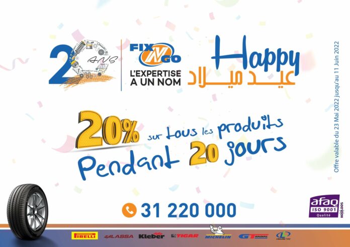 احتفالا بعيدها العشرين، أطلقت شركة « فيكس ٱند ڨو »، العلامة الرائدة في مجال صيانة السيارات، عرضا استثنائيا تمتع من خلاله حرفائها بتخفيض قدره 20 % على منتجاتها، ويمتد على 20 يوما لتعطي بذلك الرقم 20 بعدا احتفاليا مميزا لهذا العام. هذا التخفيض يشمل جميع منتجاتها لمدة 20 يوما تنطلق من 23 ماي إلى غاية 11 جوان 2022. 20% من التخفيضات؟ فرصة ملائمة للتمتع بأسعار لا تقبل المنافسة بمختلف المنتجات وأسرع الخدمات التي تقترحها شبكة مراكز السيارات « فيكس ٱند ڨو » المتوفرة في 5 مواقع استراتيجية بتونس الكبرى وهي: جبل الجلود وبومهل وسكرة والكرم والمنيهلة. فرصة ذهبية للاستفادة من جميع خدمات الصيانة السريعة للسيارات: (Pneumatique, batterie, vidange & révision, distribution, transmission, essuie-glace, freinage, échappement, climatisation (R134a et R1234YF), bougies, suspension, décalaminage). وهي فرصة سانحة أيضا للتمتّع بخدمات: l’atelier mobile multi services (Pneumatique, vidange, freinage, climatisation, batterie, décalaminage) في المنزل أو في مكان العمل وفي الوقت الذي يناسبك ليكون أقرب من مكان تواجُدك، ومن هنا جاء الشعار « يجيك وين إنت ». بالإضافة إلى ذلك، يتم أيضًا تقديم ا ثلاثة أنواع من الفحوصات المُتوفرة للسيارات: – الفحص الوقائي « 59 نقطة كشف « ، (مجاني مع كل صيانة) فضلا عن ضمان يمتد إلى حدود 36 شهرا على قطع الغيار واليد العاملة. – فحص معمق » 116 نقطة كشف « . – فحص الأمان « 97 نقطة كشف » تنتمي شركة « فيكس ٱند ڨو » إلى مجمع JOMAA، الموزع الرسمي لعجلات Pirelli, Michelin, Lassa, Kleber Tigar (etc…)، وكذلك زيوت Castrol, Areca et Synmar 20 سنة من الوجود، يعني 20 سنة من الخبرة و20 سنة من النجاح و20 سنة من الثقة. تأسست شركة « فيكس ٱند ڨو » سنة 2002 وهي تفخر بتطويرها لشبكة من مراكز الصيانة السريعة للسيارات، مما أهلها لأن تكون رائدة في مجال صيانة السيارات مع التطلّع لنمو إضافي على الصعيد الوطني والعالمي. و تحرص شركة « فيكس ٱند ڨو » بانتظام على التزويد بأحدث التقنيات والتجهيزات، بالإضافة إلى الاعتماد على فنيين مؤهلين تأهيلا عاليا لضمان توفير خدمات غاية في الجودة والسرعة والفاعلية والشفافية. كما أن شركة « فيكس ٱند ڨو » هي أول شبكة لمراكز صيانة السيارات في تونس المتحصلة على شهادة ISO9001 في نسخة 2015 لمواصفات الجودة الكاملة. وحتى العام الجاري 2022 فإن العلامة المميزة « فيكس ٱند ڨو » قدمت خدماتها لأكثر من 70 ألف حريف، بنسبة رضاء تجاوزت 93% لتكون بذلك علامة تجارية جديرة ومسؤولة تضع العميل في صميم متطلباتها لمزيد من المعلومات يمكنكم الاطلاع على خدمات الشركة على موقعها الرسمي: ww.fixngo.tn ماذا يعني بلوغ العشرين سنة! أو على صفحات التواصل الإجتماعي FIXNGO TUNISIE :