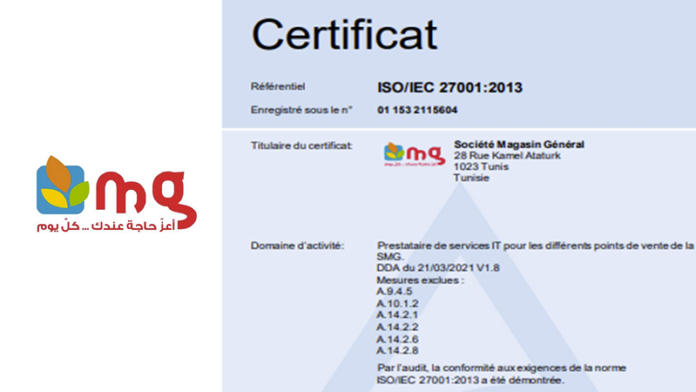 توجت المغازة العامة، العلامة التونسية الرائدة في المساحات التجارية الكبرى، لالتزامها بفعالية نظام إدارة أمن المعلومات (SMSI) لتصبح بذلك أول علامة تجارية في تونس وأفريقيا تحصل على شهادة .ISO 27001