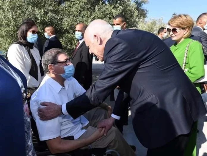 وظهر الحبيب الصيد وهو على كرسي متحرك إثر الوعكة الصحية التي ألمت به واستوجبت إيواءه بالمستشفى.