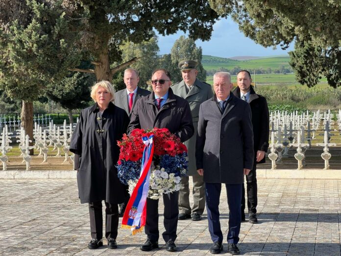 À l’occasion du 110ème anniversaire du débarquement de l’armée serbe à Bizerte le 9 janvier 2026, une délégation du Gouvernement de la République de Serbie conduite par S.E. Monsieur Zoran Antic, Secrétaire d’État au Ministère du Travail, de l’Emploi, des Anciens Combattants et des Affaires Sociales de la République de Serbie, S.E. Madame Dijana Ivancic, Ambassadrice de la République de Serbie en Tunisie, et S.E. Monsieur Sinisa Radovic, Ministre adjoint de la défense pour les ressources humaines par intérim, a visité les cimetières militaires serbes de Menzel Bourguiba et de Bizerte où elle a déposé des gerbes et a rendu hommage aux soldats serbes morts pour la patrie pendant la Première Guerre mondiale.
