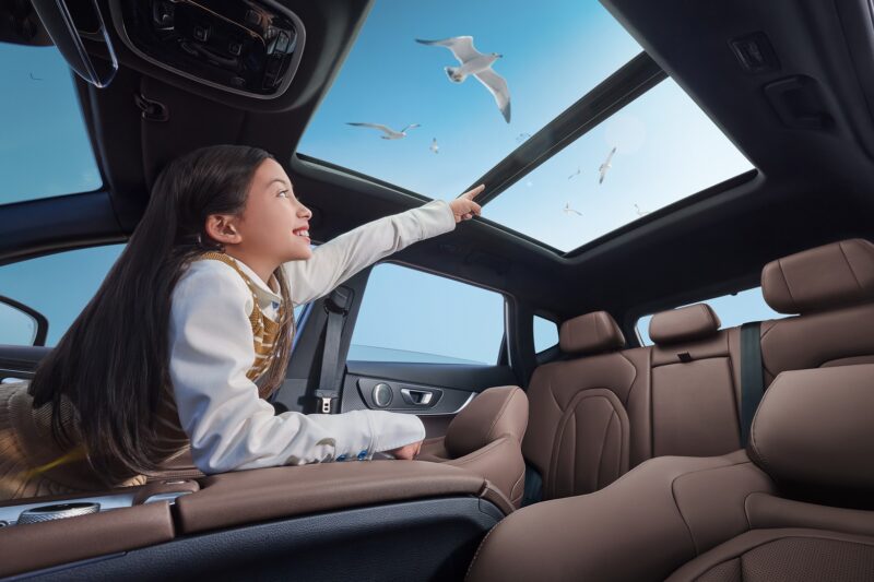 L’ambiance intérieure se distingue par un haut niveau de raffinement. L’éclairage d’ambiance à 64 couleurs crée une atmosphère sur mesure, tandis que le système audio Sony à 8 haut-parleurs garantit une immersion sonore de qualité. Le siège conducteur à réglage électrique assure une ergonomie optimale, complétée par un toit ouvrant extra-large de 1,1 m² avec fonction anti-pincement, apportant luminosité et sensation d’espace.