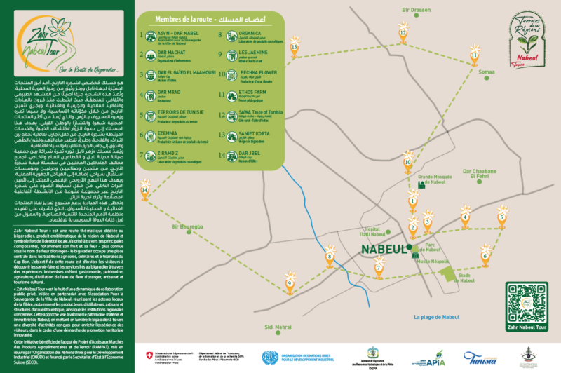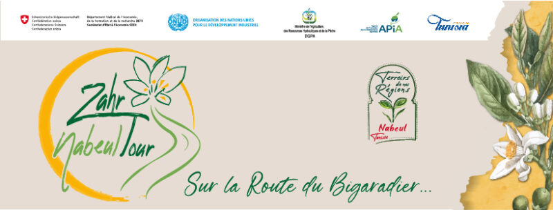 Développé dans le cadre de la stratégie nationale de valorisation des produits du terroir, portée par le Ministère de l’Agriculture (DGPA) en partenariat avec l’Agence de Promotion des Investissements Agricoles (APIA), et avec l’appui du projet PAMPAT (mis en œuvre par l’Organisation des Nations Unies pour le Développement Industriel – ONUDI, avec le soutien de la coopération suisse – SECO), « Zahr Nabeul Tour » s’inscrit dans une dynamique nationale de mise en valeur des produits du terroir et de leur intégration dans des expériences touristiques innovantes.