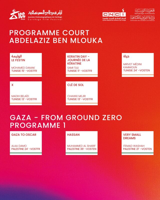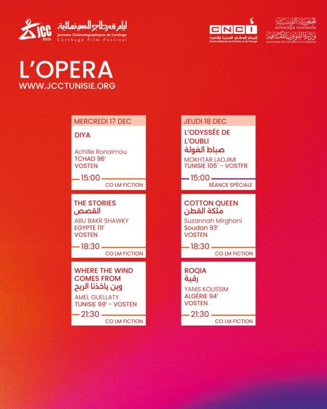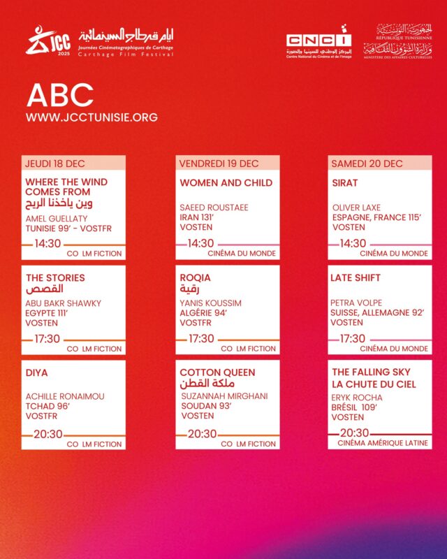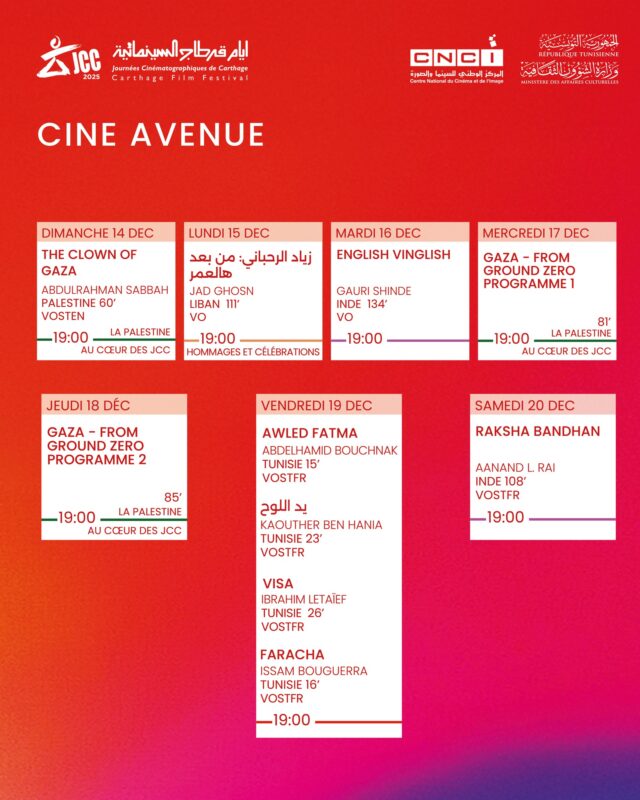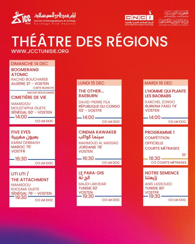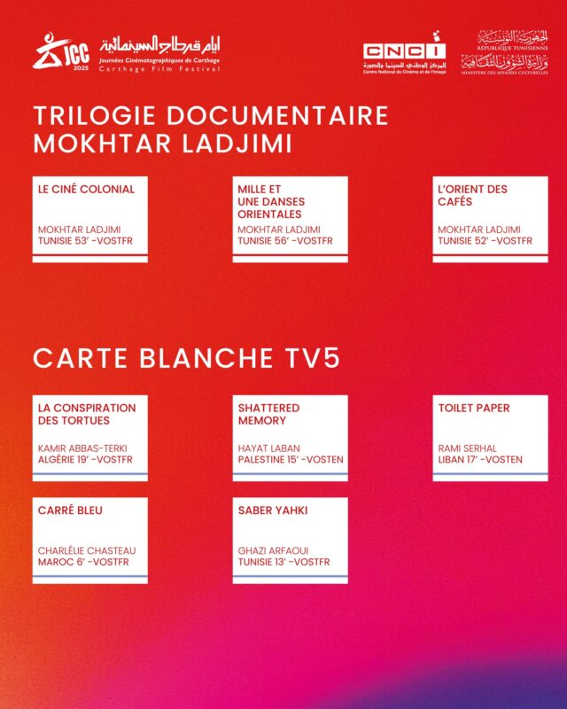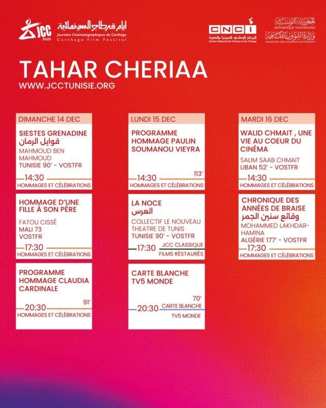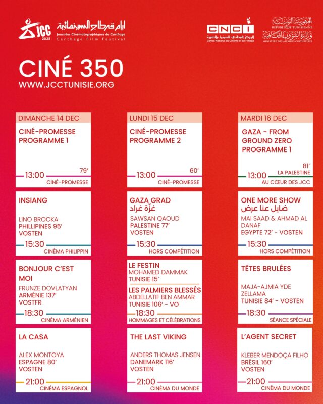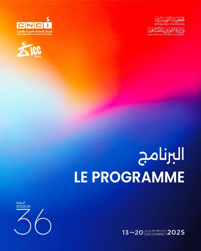 Le programme complet de la 36ᵉ édition des Journées Cinématographiques de Carthage (JCC), qui se tiendra du 13 au 20 décembre 2025 à Tunis, vient d’être publié. Cette édition s’annonce riche, ouverte sur le monde arabe, africain et international, fidèle à la longue tradition du festival de valoriser les cinématographies du Sud et les œuvres engagées.
