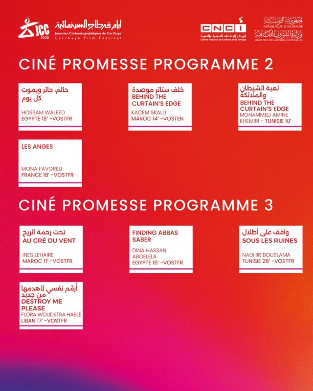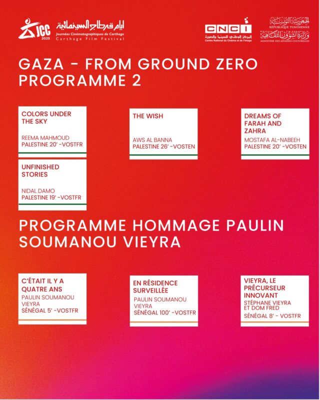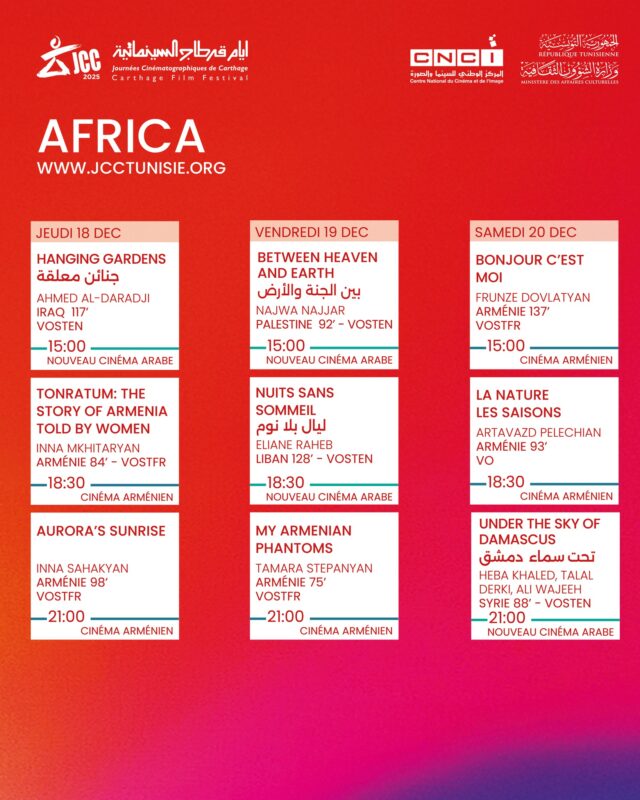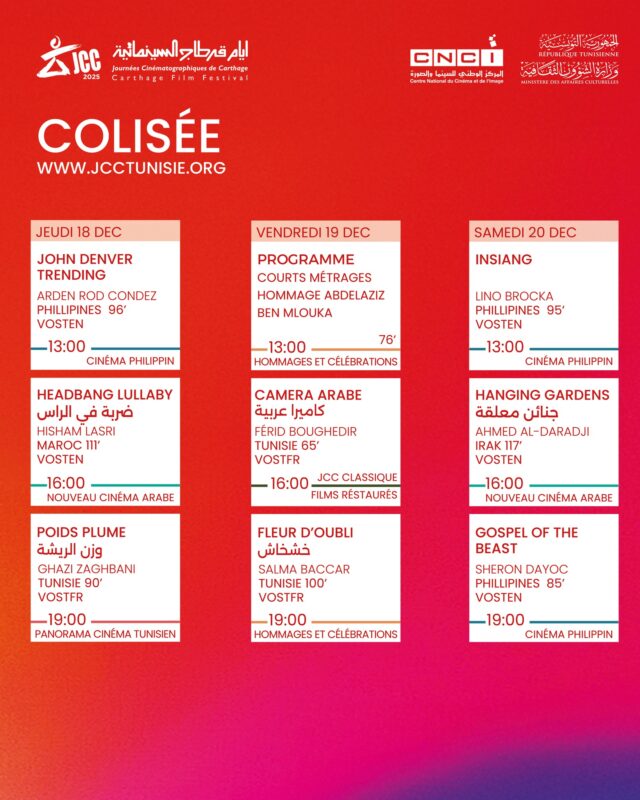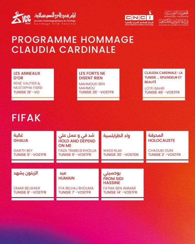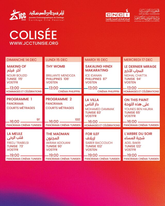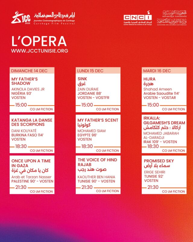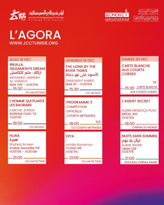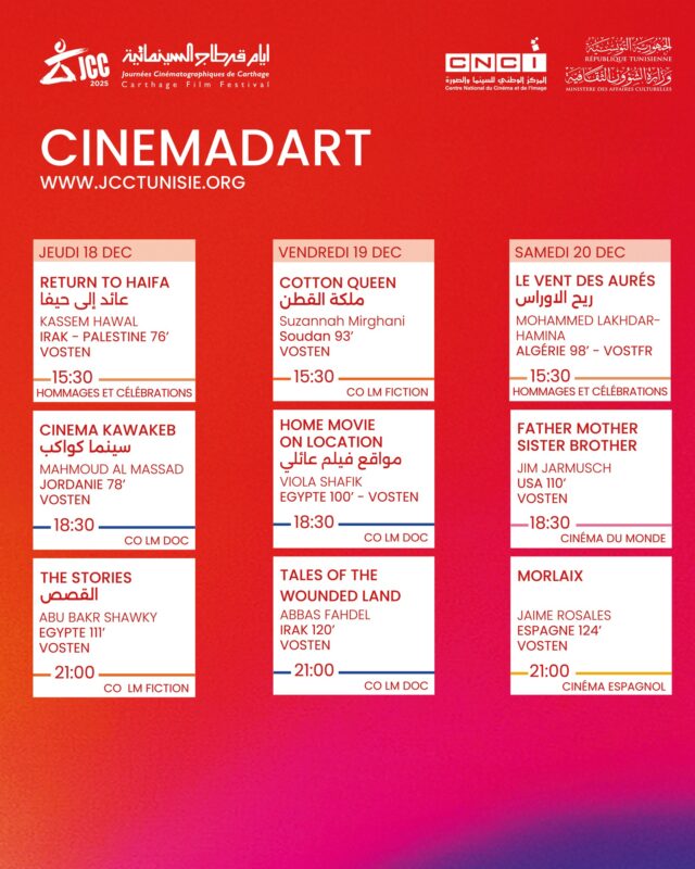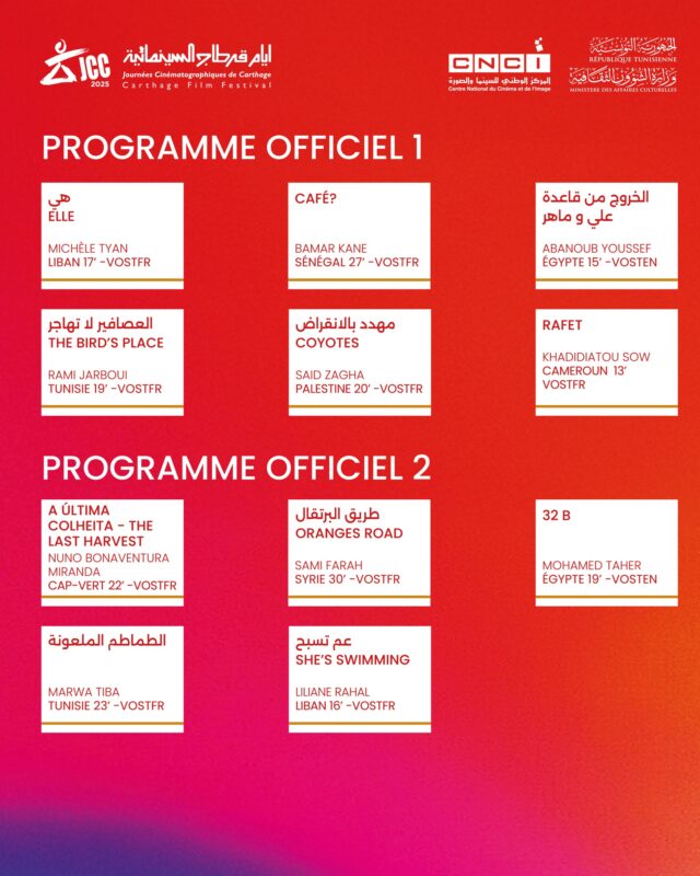 Le programme complet de la 36ᵉ édition des Journées Cinématographiques de Carthage (JCC), qui se tiendra du 13 au 20 décembre 2025 à Tunis, vient d’être publié. Cette édition s’annonce riche, ouverte sur le monde arabe, africain et international, fidèle à la longue tradition du festival de valoriser les cinématographies du Sud et les œuvres engagées.