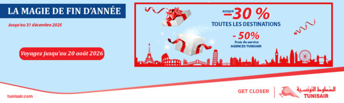 À l’occasion des fêtes de fin d’année, Tunisair donne le coup d’envoi de sa nouvelle campagne promotionnelle intitulée « La Magie de fin d’année », invitant ses clients à anticiper dès aujourd’hui leurs projets de voyage jusqu’au 31 août 2026, sur l’ensemble de son réseau, au départ et à destination de la Tunisie.